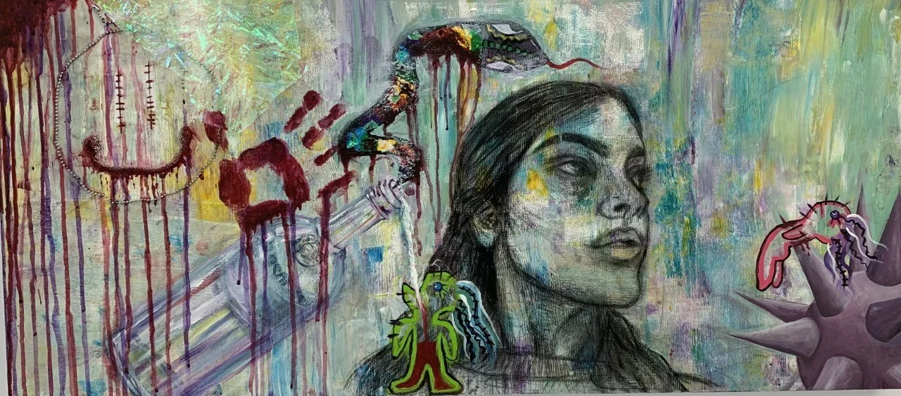 Transcend, 16’’× 47’’, Mixed Media: Acrylic paint, Charcoal, iridescent paper and metal on canvas, 2022 View fullsize